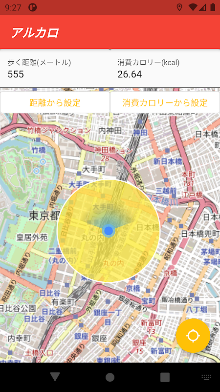 消費カロリーを入力すると、そのカロリーを消費するために現在地からどこまで歩けばよいのかを地図上に表示します。