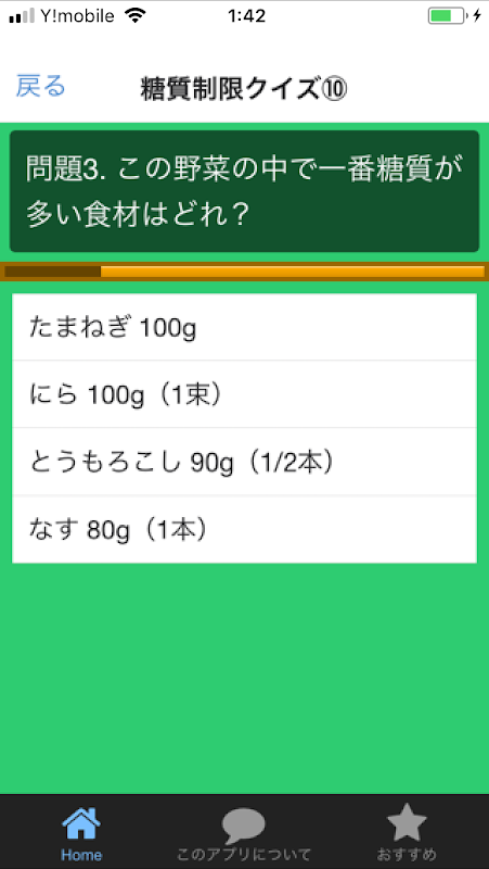 食材、料理の糖質量などに関するクイズアプリ。糖質量をこのアプリで学んで健康的にダイエットしよう。