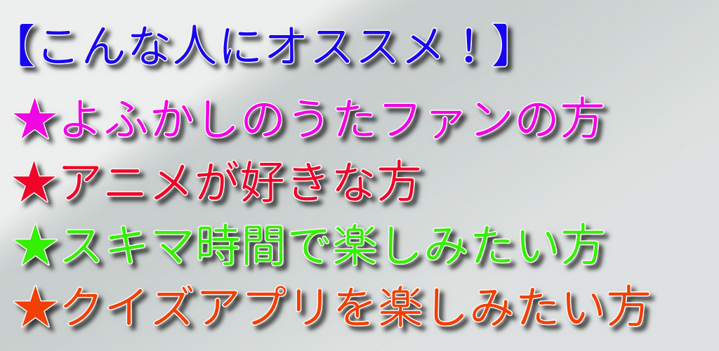 大人気アニメ「よふかしのうた」に関するクイズアプリです。