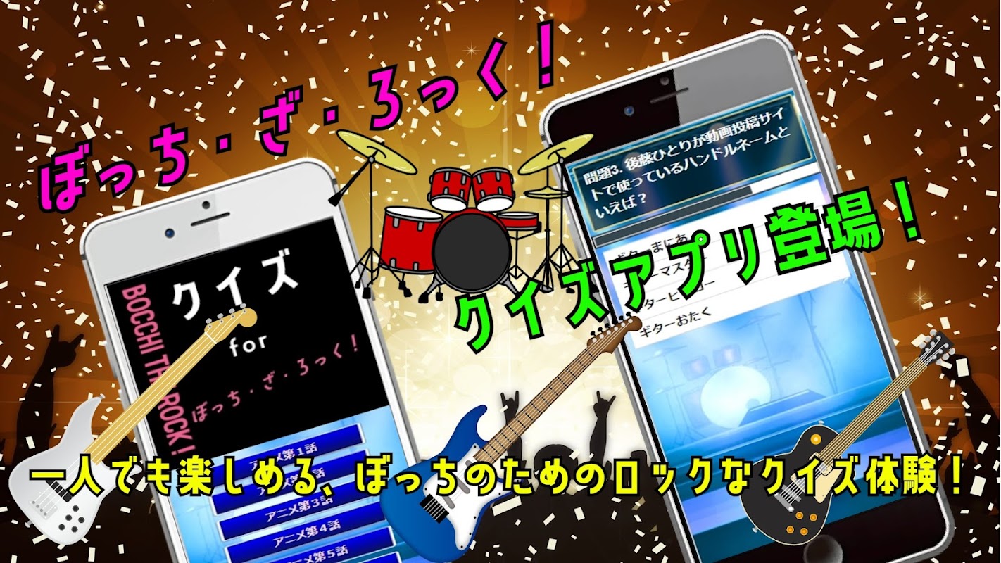 大人気アニメぼっちざろっく(BOCCHI THE ROCK)のクイズアプリ登場。 漫画・アニメ・等から幅広く問題を出しております。非公式アプリです。