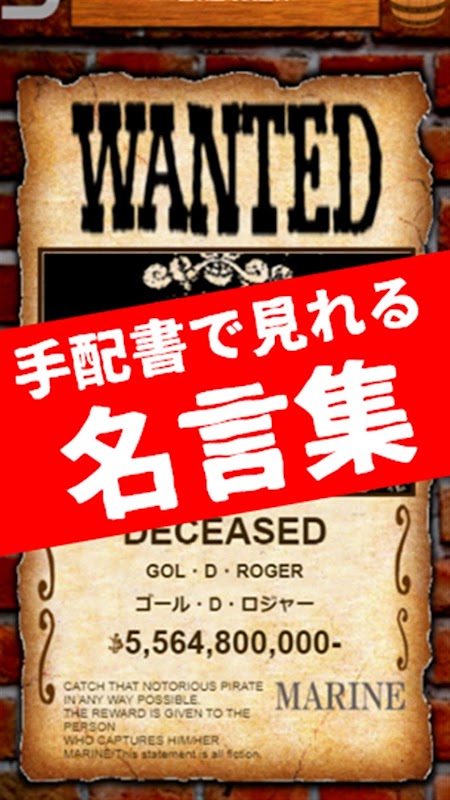 ONE PIECE(ワンピース)に登場する海賊の名ゼリフや懸賞金データが手配書風に閲覧できる非公式名言アプリです。