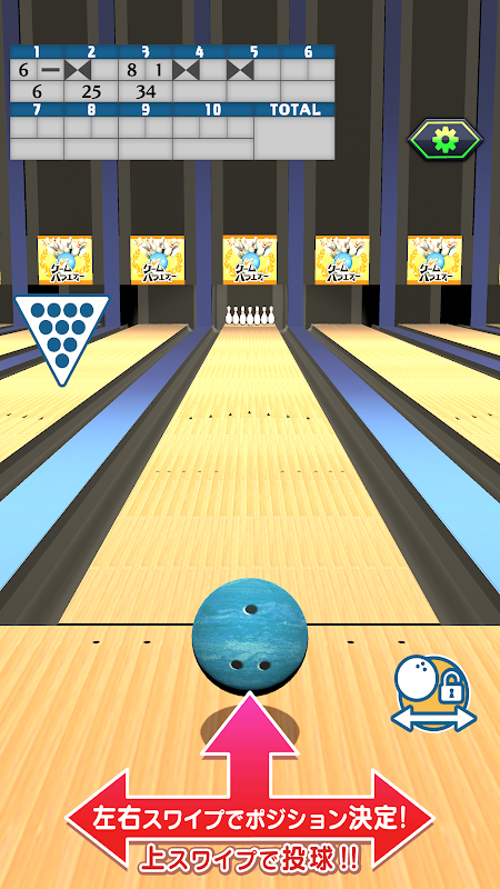 前後左右の軌道変更によって、複雑な配置のピンを順番通り倒しましょう。