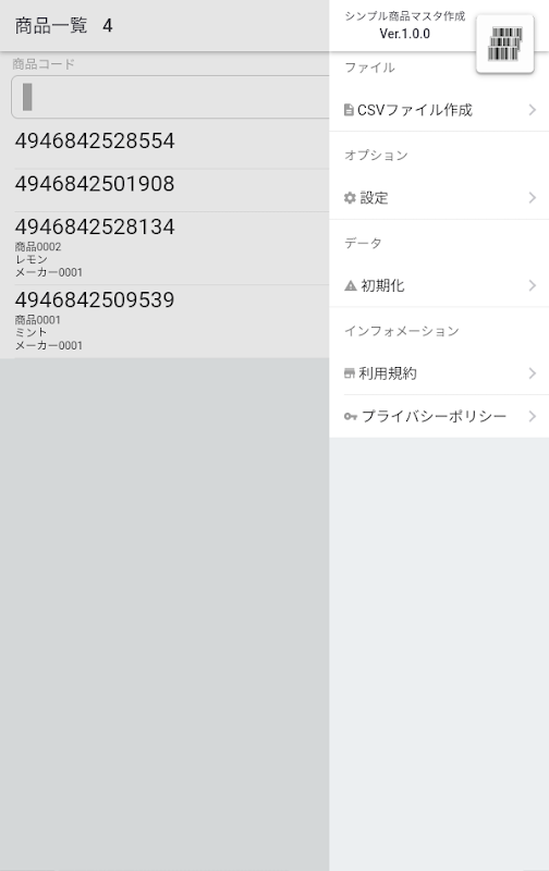 バーコードを読み取って、商品情報を入力して、CSVファイルを作成する。至ってシンプルな機能を持つアプリです。