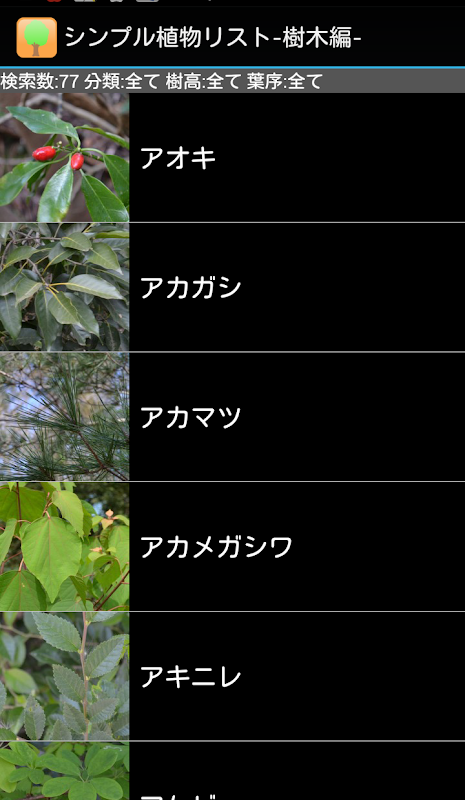 街路樹、庭木などの園芸種から、身近な山野に自生する木までよく見かける木を集めた樹木図鑑アプリです。