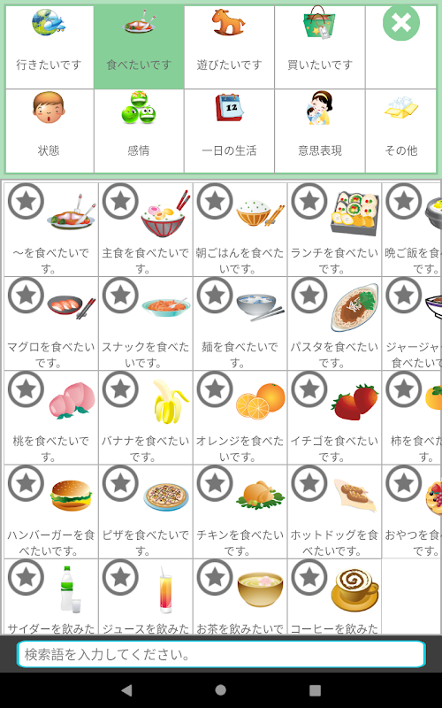 2.たとえば、「食べたいです」を選ぶと、食べること関連の下のカテゴリ(主食、軽食、果物など)画面に移動します。