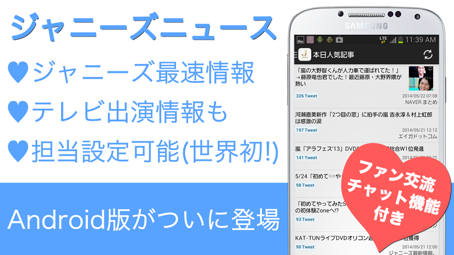 ジャニーズニュース決定版!チャット機能もあるからファンの情報交換・交流も可能です!ジャニーズ裏話や最新情報まで、ジャニーズファン必携のまとめニュースアプリ!