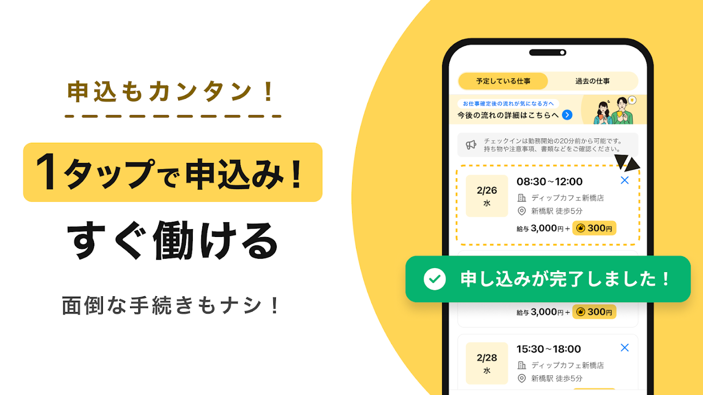 ・従来のバイトのように面接を受けたり、履歴書を用意したりする必要がありません。お気に入り案件に応募したら、すぐに単発・スキマバイトで働けます。