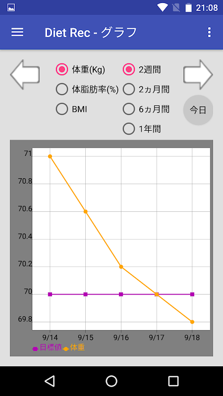 体重、体脂肪率、BMIを、目標値と共にグラフ表示