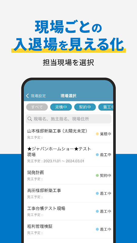 「ダンドリタイム -入退場アプリ-」は、「ダンドリワーク -施工管理アプリ-」で登録されている現場を選択することで、現場ごとの入退場の記録が可能です。