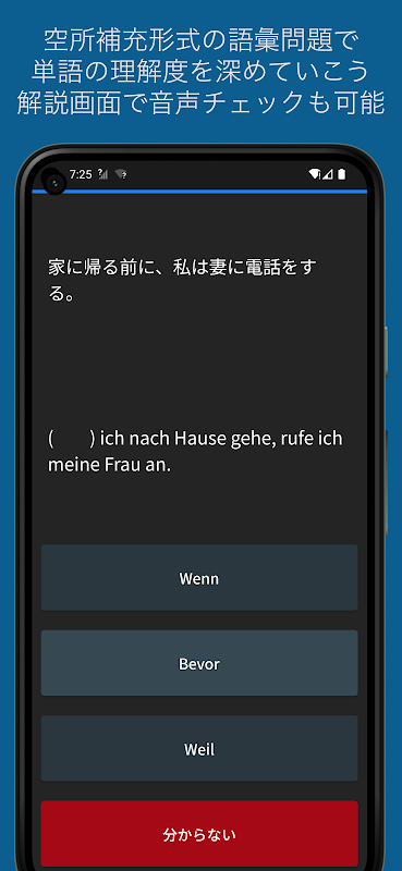 単語とセンテンスの理解度をネイティブ音声と共にチェックすることができます。画面をタップするごとにドイツ語と日本語が順番に表示されます。最後に「分かる」「分からない」を選ぶことができるので、自身の理解度チェックとして利用することが可能です。