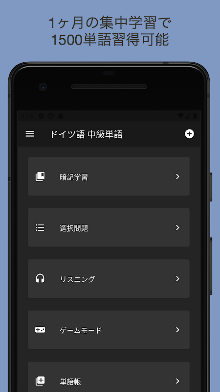 ドイツ人女性によるネイティブ音声を採用。暗記、選択、リスニング、ゲームモード、4機能搭載。約1500語を学習可能。独検2級〜準1級、国際試験B1〜C1に対応。