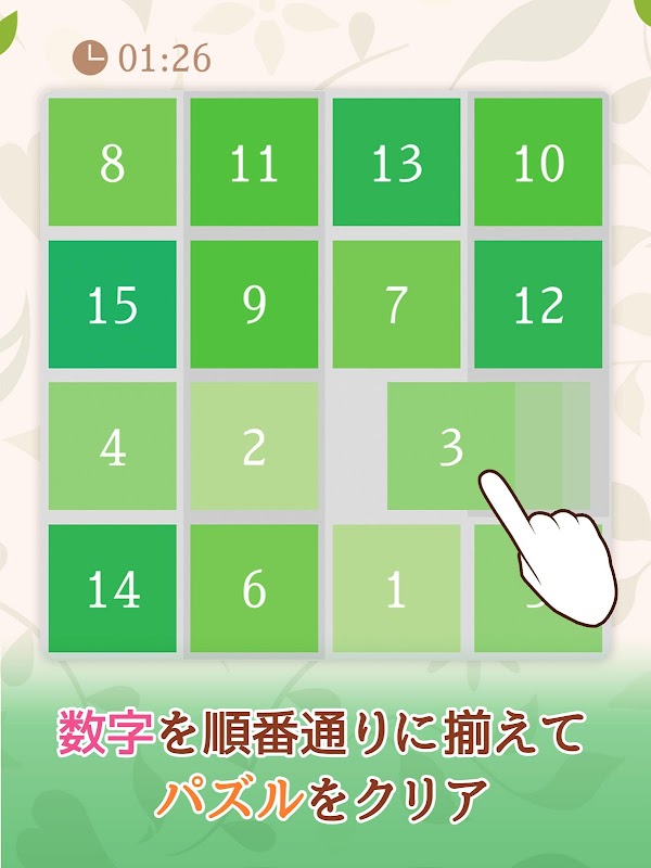 数字やイラストを正しい順番に並び替えるシンプルなパズルです。操作はパズルをスライドさせるのみ。難しいルールや操作はありません。
