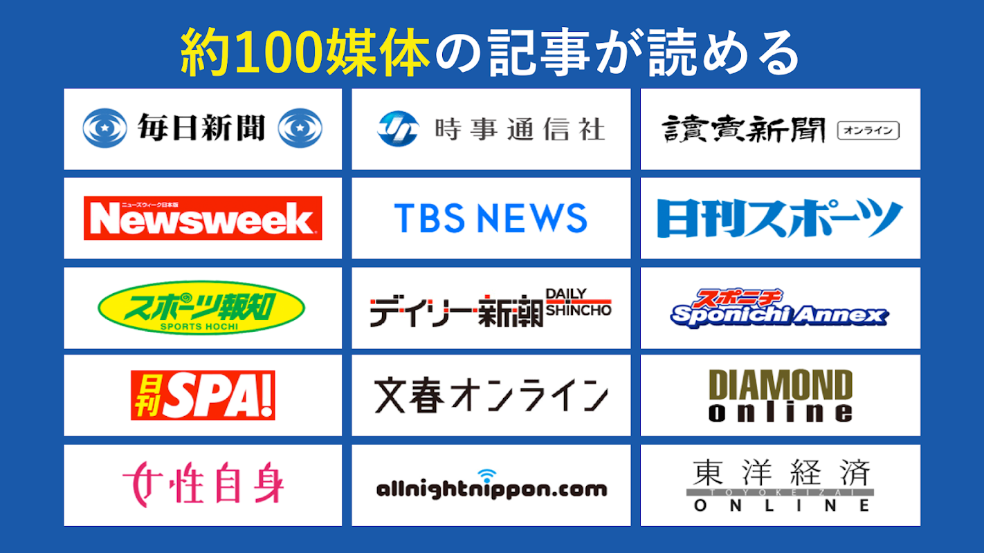 読売新聞、毎日新聞、時事通信、東洋経済オンライン、ダイヤモンドオンライン、PRESIDENT Online(プレジデント)、Newsweek(ニューズウィーク)、J-CASTニュース、日刊スポーツ(nikkan sports)、日刊ゲンダイ、文春オンライン、NEWSポストセブン、SPA!(スパ!)、All about(オールアバウト)、Sportiva(スポルティーバ)…など約100媒体のニュースを掲載しています。