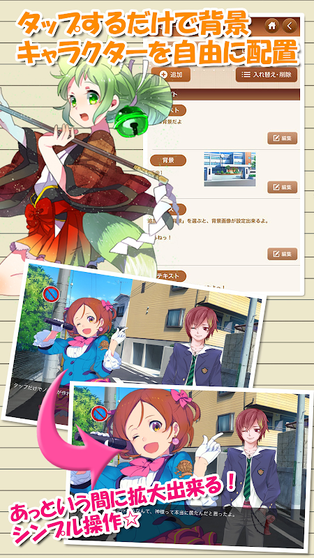 指一本でノベルゲームを直感的に作成、完成すれば即座に公開も出来ます。