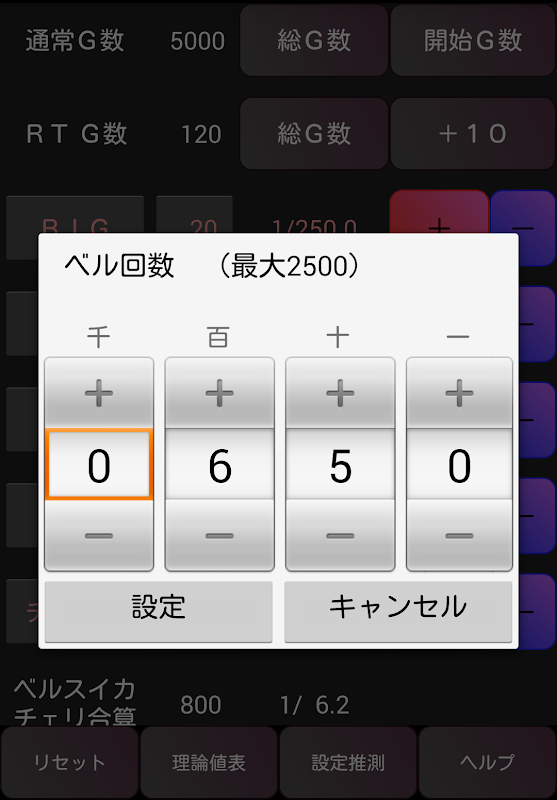 「設定推測」ボタンを押すと、上記フラグ出現数とゲーム数から設定を予測表示します。