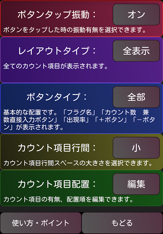 画面下部の「使い方・ポイント」ボタンをタップしてご確認下さい。