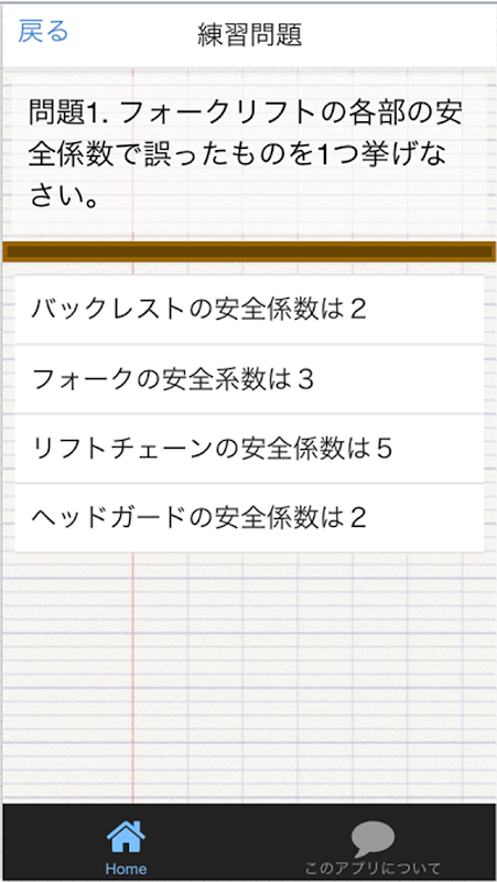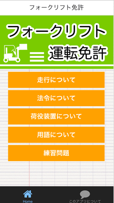 このアプリは、フォークリフト運転技能取得の学科試験のための無料学習アプリです。すべて選択問題で作られていますので、気軽に楽しみながら繰り返し学習が出来ます。
