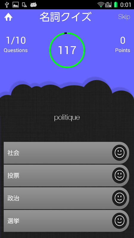 名詞・動詞・形容詞・文法穴埋めなどあります。過去の最高得点は表示され、正解と不正解音もでます。