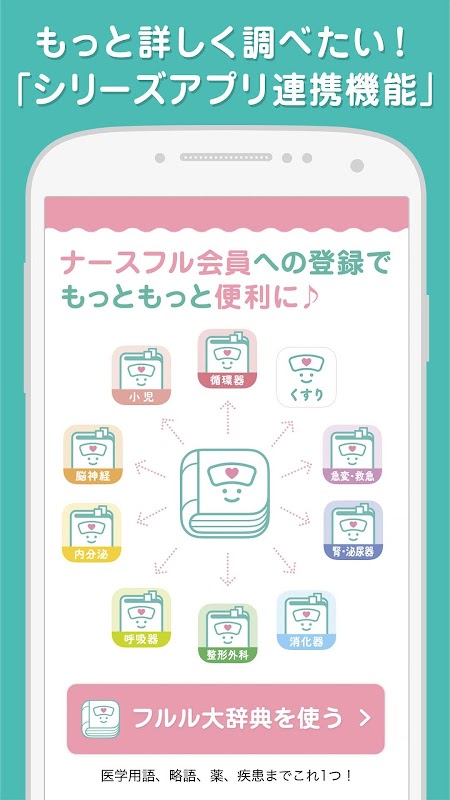 フルル大辞典は、看護師・看護学生のキャリアを応援する「ナースフル」が提供する無料の医学、看護辞典(辞書)アプリです。