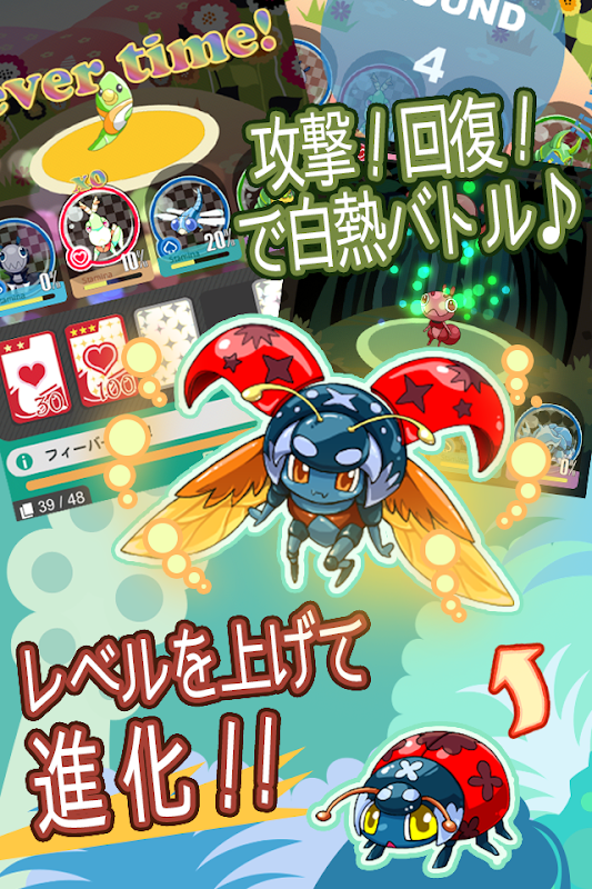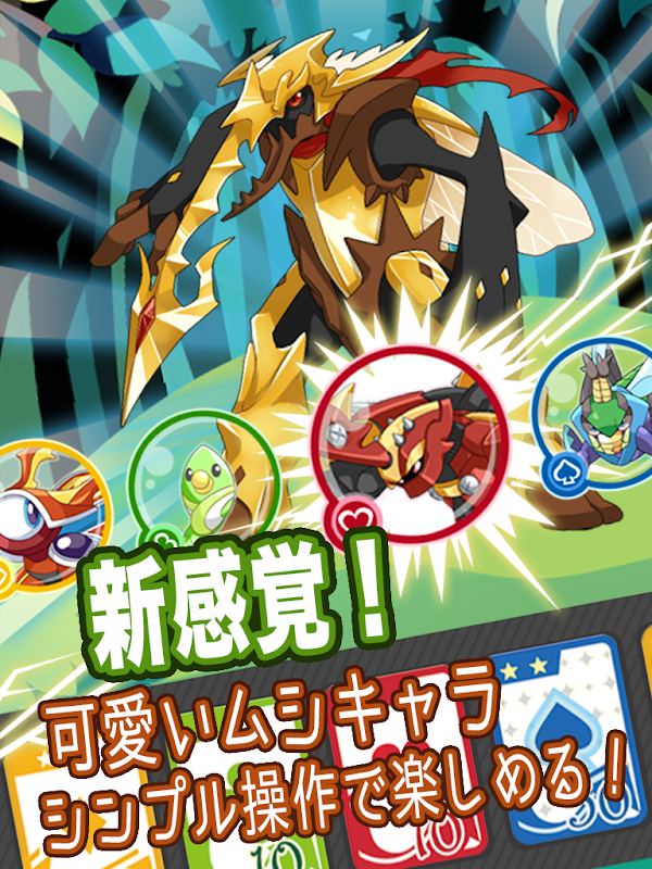 かわいいムシたちを捕まえて育てよう! シンプル操作バトルで空いた時間にサクッと楽しめます。バトル中にムシたちが進化!新感覚のゲームをどうぞお試しあれ!