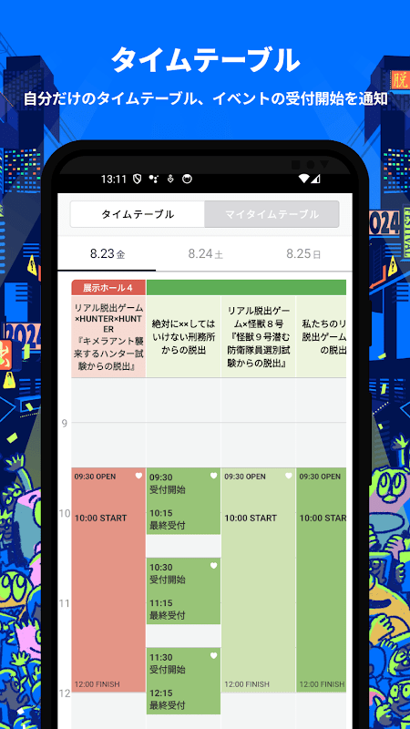コンテンツの情報やタイムテーブル、会場マップやインフォメーションなど、イベントを便利に楽しむための情報・機能を搭載したアプリです。