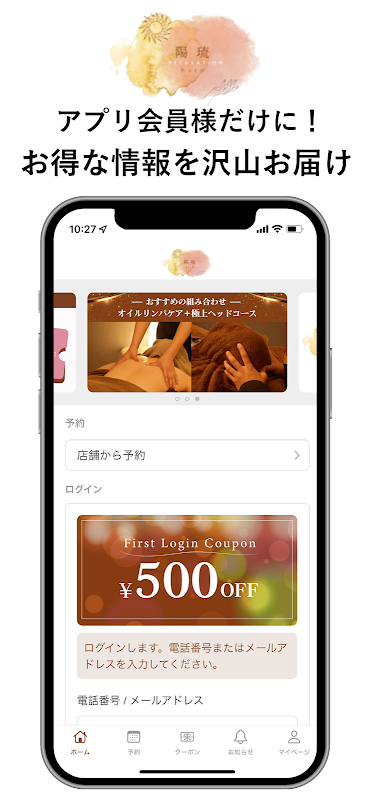 アプリを通してリラクゼーション陽流の新着情報やお得な情報を受け取ることができます。また、いつでもお手元のスマートフォンから、メニューやご希望のお時間帯のチェック・ご予約などが可能です。アプリをインストールしていただくことにより、リラクゼーション陽流をより便利に身近にご利用していただけます。