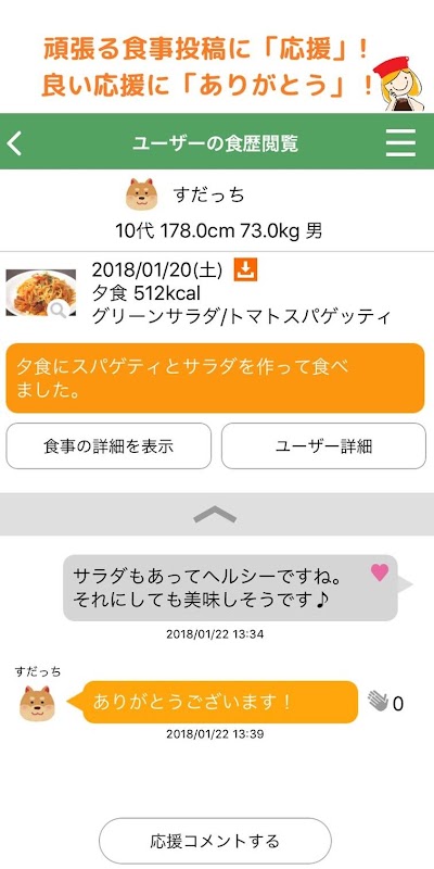食事の画像を投稿するだけで応援メッセージを受け取ることができます。