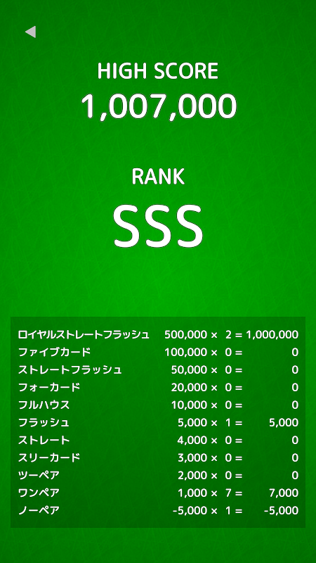 『手札』のカード5 枚がポーカーの『役』になれば、『手札』が消え、『役』に応じたスコアを獲得できます。