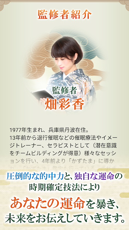 噂全国区。圧倒的な人気を誇り鑑定数8000人を鑑定した大和播磨の占術師「畑彩香」彼女のかずたま占いが遂に登場。秘匿1万年の秘術であなたの現実を見抜いていきます。