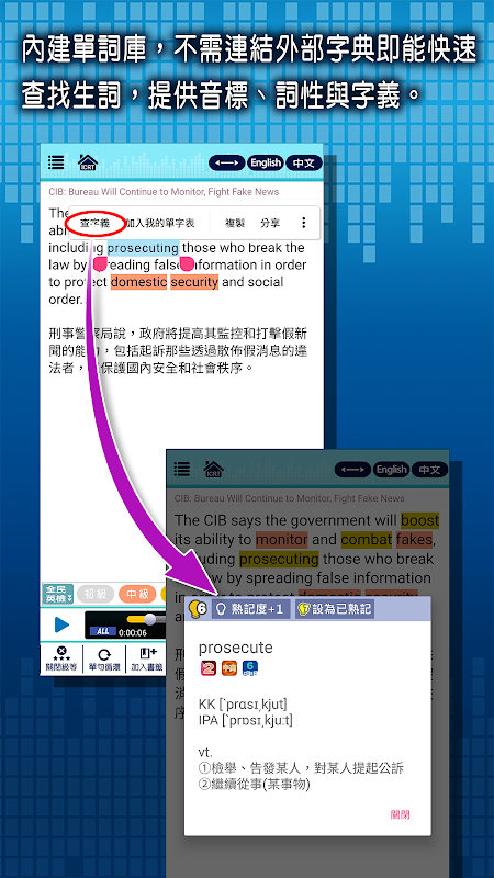 10.【単語の意味を確認する】内蔵の単語データベースで、単語の意味をすばやく調べ、記事の内容を理解します。