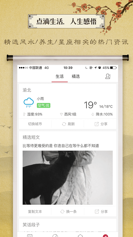 详细描述:我们了解安卓用户的痛,我们不想做招人厌烦的自启和后台服务。所以,这是一款干净的工具软件,占用你极低的内存,却尽全力的为你提供详细、准确、权威的农历和黄历信息。没有多余的插件,这就是一本老黄历百科全书。黄历信息包括每日宜忌、时辰宜忌、诸神方位、冲煞、五行、胎神占方、彭祖百忌、吉神宜趋、凶神宜忌、二八星宿等等。除此之外,还包含了中国星座、西方星座、天干地支表示等等,是市面上信息全面、干净纯粹的中华老黄历。
