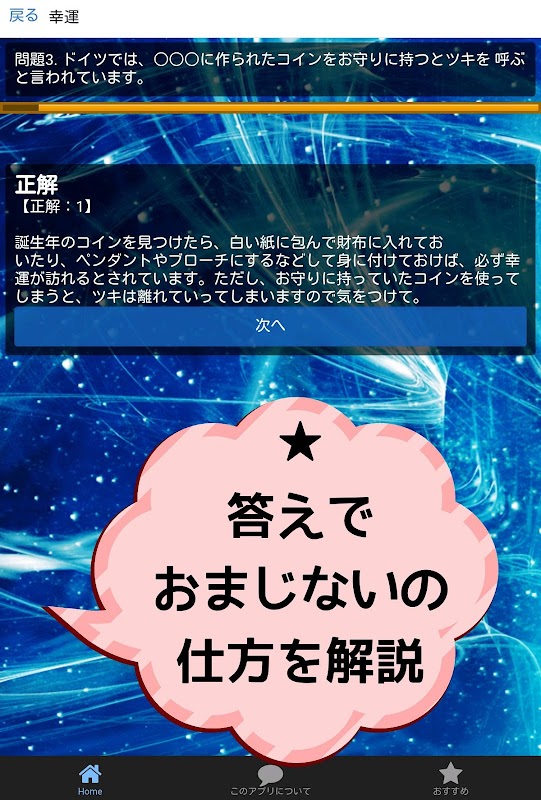 幸運、恋愛運、金運、健康運などおまじないのクイズアプリです。