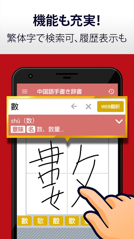 中国語(簡体字/繁体字)を手書きして、単語の意味や発音を調べることができます。 便利な中国語辞書/中日辞典として、中国語の勉強や旅行先での翻訳に活用ください!