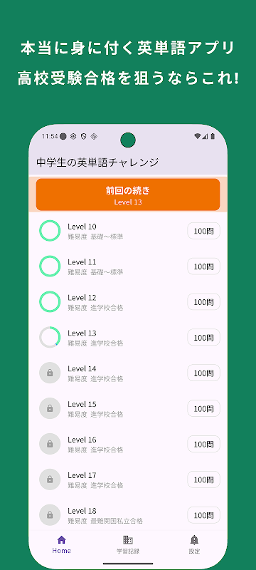 このアプリには基礎から難関高校入試レベルを狙うのに必要な英単語・熟語が、レベル別に2000単語収録されています。