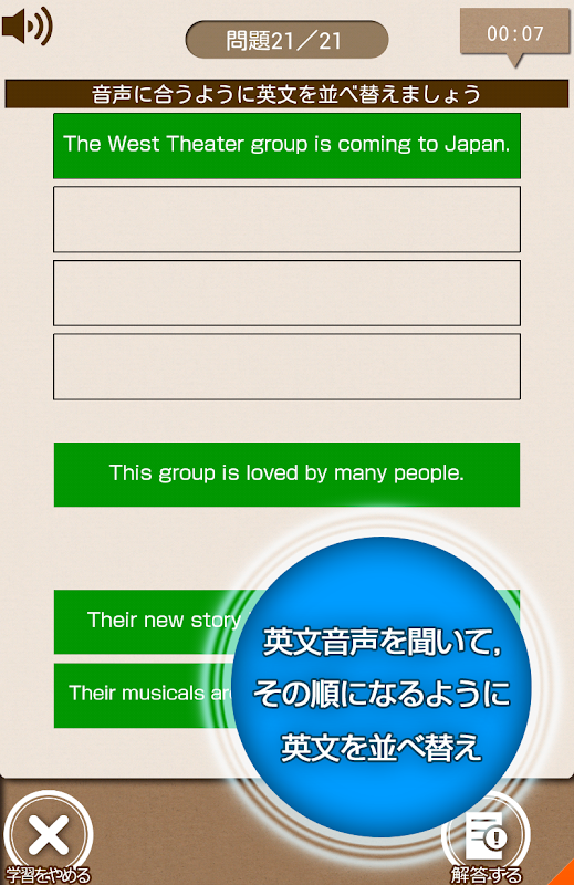 解答後には必ず自動的に音声が再生されます。音声を繰り返し聞くことで,英単語や英文の定着をはかります。