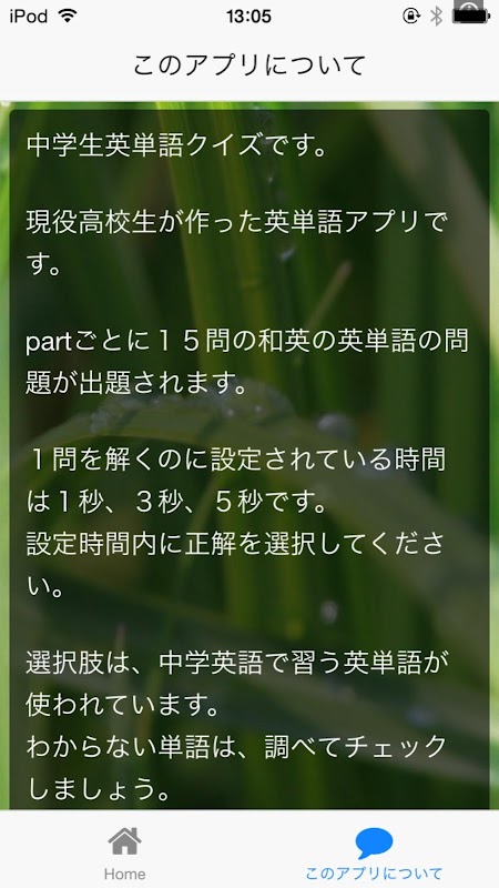 中学生英単語クイズ5secpartごとに15問の和英の英単語の問題が出題されます。
