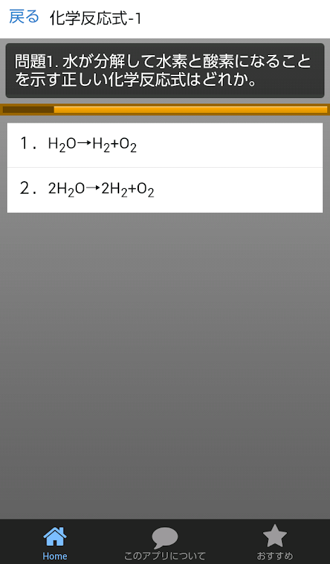 水素、酸素等の原子記号から酸化、還元の化学反応式までをクイズアプリにしました。