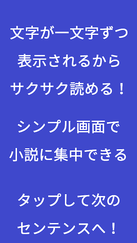 著作権切れの小説を読むアプリです。ゲームのテキストのように一文字ずつ表示され、さらに、スマホ画面が文字でいっぱいにならないように配慮しています。