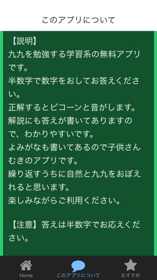 九九を勉強する学習系の無料アプリです。半数字で数字をおしてお答えください。解説にも答えが書いてありますので、わかりやすいです。楽しみながらご利用ください。
