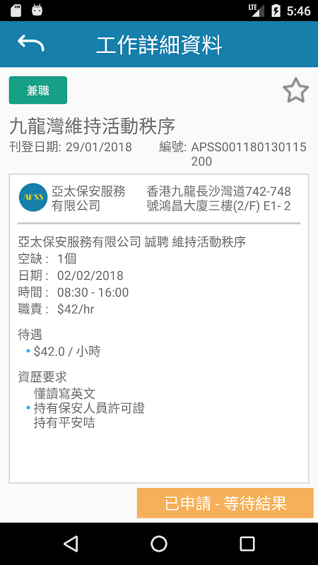 智能手機應用程式 “亞太搵工啦” 是由亞太保安服務有限公司開發,目的方便合資格保安員尋找合適自己的工作。保安員可透過此手機應用程式尋找合適自己的工作,操作十分簡便。