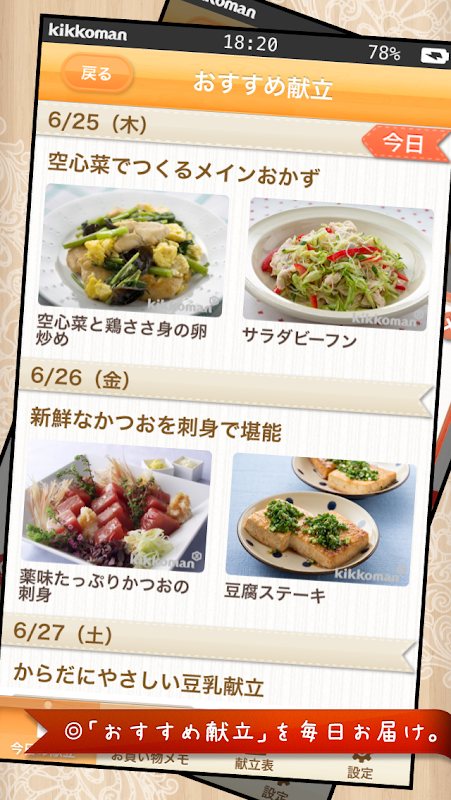 「今日の献立」を使えば、選りすぐりのキッコーマンの公式レシピから、簡単に毎日の献立を決めることができます。カロリーグラフ、1週間先の献立をあらかじめ決められる献立表、お買い物に役立つ、お買い物メモ機能もついています!