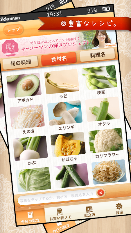 毎月追加される旬の料理から、94種類の食材名から、定番の料理検索から、キッコーマンの公式レシピを選べます。