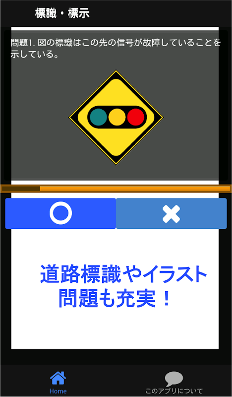 仮免許学科試験アプリの決定版!仮免の練習問題を教科ごとに多数掲載!道路標識や危険予測イラスト問題にも対応!詳細な解答解説付き!仮免許 試験前の勉強に。