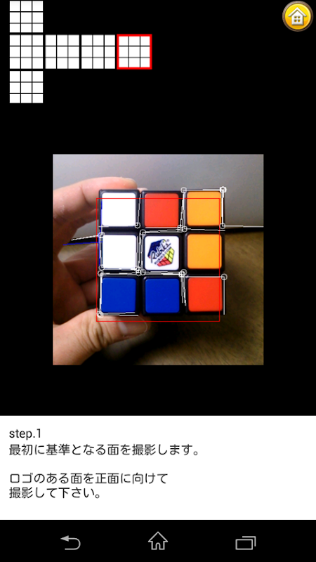 実物のルービックキューブ(3×3)本体6面を撮影し、「解析する」をタップすると最短手順での解法が表示されます。画面に沿ってルービックキューブ本体を回していくと6面を完成することができます。メガハウス製(旧正規品含む)のルービックキューブが対応しています。