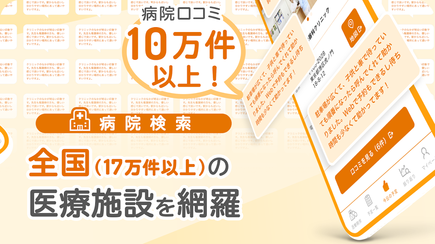 日本全国17万件の病院・クリニックがエリア、最寄りの駅、現在位置から検索が可能。