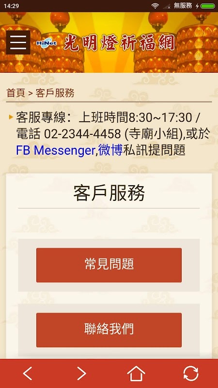 客戶服務:有常見問題、聯絡我們、訂單查詢等服務