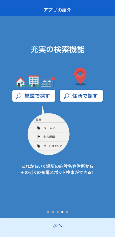 現在地の周辺だけでなく、施設で探す、住所で探す機能でこれから行く場所を探し、その周辺の充電スポットを見ることができます。