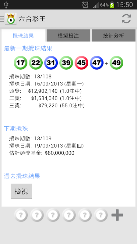 顯示最新攪珠結果、下期投注資訊及過去100期攪珠結果,資料齊全又準確。