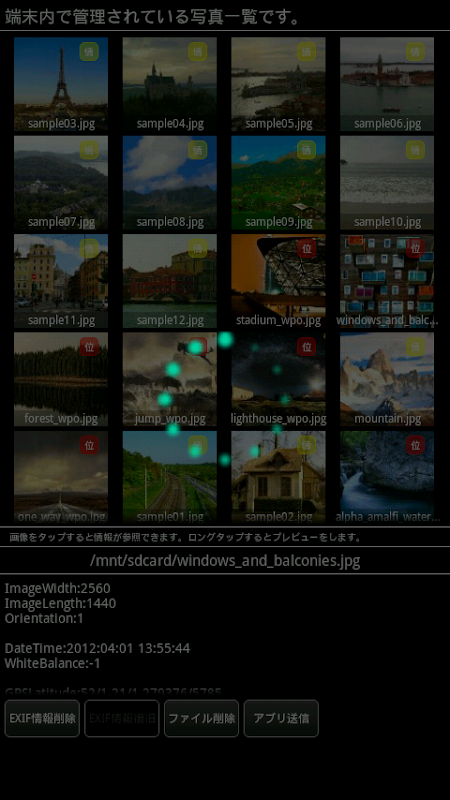 デバイス内の画像ファイルを公開する前にチェックすることが出来ます。 位置情報等を削除する事も可能です。