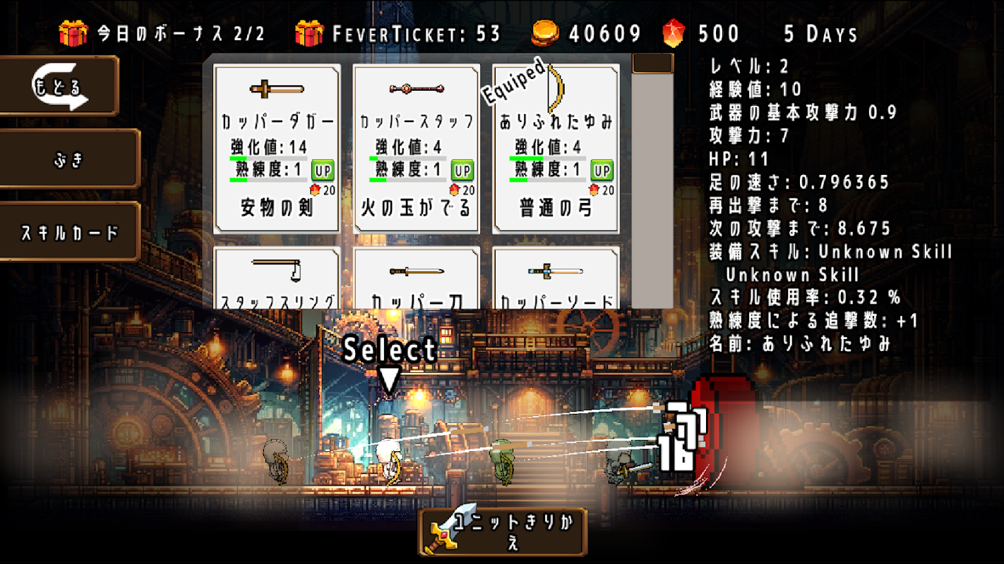 メニューの装備画面で、出撃に使う武器を選択可能。
